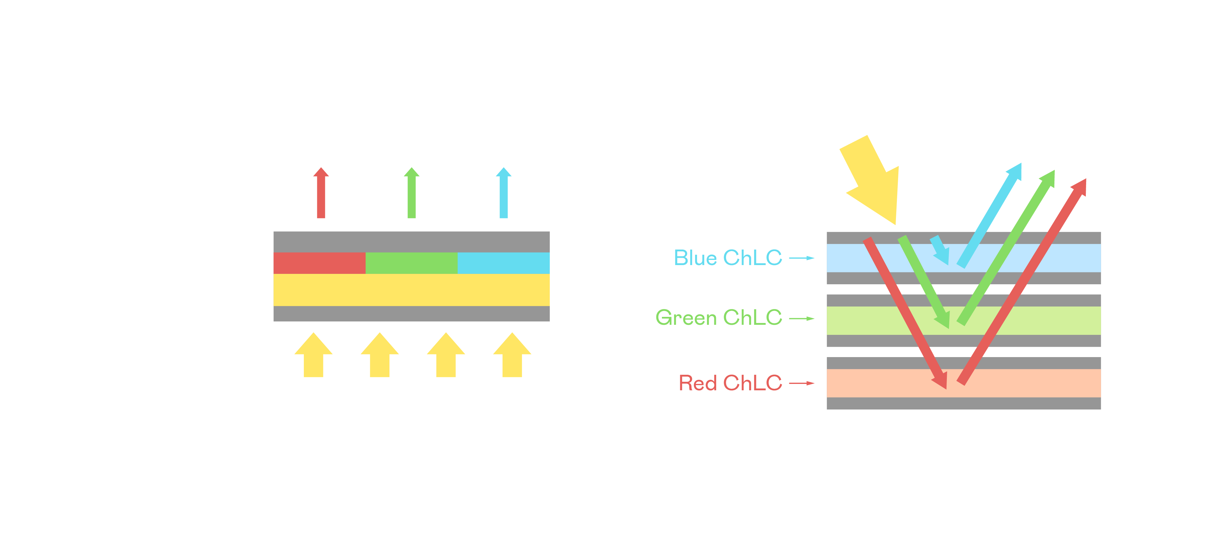 抖圈胆固醇液晶显示器是由红、绿、蓝三层胆固醇液晶面板堆叠而成,并采用无彩色滤光片设计,减少环境光在反射过程中的损耗。